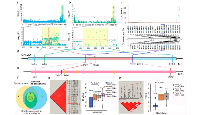 本研究中,作者利用小麦660K和90K芯片对2个关联群体进行小麦黄花叶病(WYMV)抗性位点的全基因组关联分析(GWAS),在小麦的2D染色体上筛选到1个重要的抗病位点。针对该位点进行重组自交系群体(UP-RIL)的构建和标记开发,通过QTL分析将该Qupwym.hau-2DL位点锁定在2D染色体上的604.1-612.2 Mb。结合该区间所有基因在根茎叶的表达丰度、双亲的多态性差异、WYMV的诱导表达谱及显著性SNP的单倍型分析结果,最终筛选到TraesCS2D02G513600作为该位点的抗性候选基因。此外,对包含该抗病位点的亲本Jingshuang16与Bainong64杂交构建双单倍体群体(BJ-DH),结合新开发标记的基因分型结果进行QTL定位,鉴定到TraesCS2D02G513600是Qupwym.hau-2DL的候选基因中唯一位于Qbjwym.hau-2DL区间的基因。