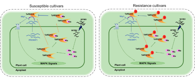 遗传学证据发现,过表达TaRD21AR显著抑制WYMV的侵染。此外,TaRD21AR可通过水解植物内源小肽前体蛋白PROWIP1,形成成熟小肽Wip1,激活MAPK信号途径,增强小麦对WYMV的抗性。