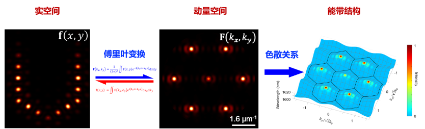 课题组通过将两套扭转的光子晶体晶格加工在同一层半导体薄膜,得到光学莫尔超晶格结构。结构中的非局域Bloch模式通过莫尔倒格矢产生耦合,形成实空间局域的本征模式。在能带中这些局域的本征模式对应于莫尔平带。纳米激光阵列的实空间和动量空间电场强度分布由傅里叶变换相互联系,动量空间分布通过能带结构对应出频率分布,莫尔平带保证了频率的简并性,使得任意形状纳米激光阵列的相干激射成为可能(如图2、图3)。