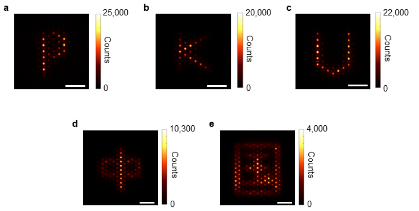 图3. 莫尔纳米激光阵列以“P”“K”“U”和 “中”“国”图形生成阵列化相干激射。由于莫尔平带的本征能量简并特性,任意形状的莫尔纳米激光阵列均能够通过自发相位锁定产生相干激射。图中标尺均为10微米