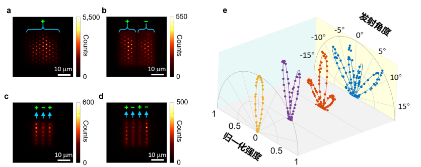 课题组还进一步对纳米激光的相对相位进行控制,实现了相控阵纳米激光阵列。图5展示了具有不同相对相位分布的4个纳米激光阵列实空间和动量空间图案。图中标“+”和“−”的纳米激光之间相差180度的相位,这些相位分布决定了4个纳米激光器阵列具有不同的出射方向分布。