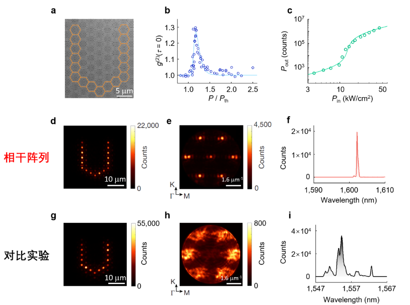 图4. U形莫尔纳米激光阵列相干特性。(a)扫描电子显微镜照片,橙色六边形标出了构成U形的17个莫尔纳米激光;(b)相干阵列的二阶强度关联函数随泵浦功率变化图;(c)输出功率随输入功率变化图;(d—f)相干阵列激射的实空间图案(d)、动量空间图案(e)和光谱(f);(g—i)作为对比器件的非相干阵列激射的实空间图案(g)、动量空间图案(h)和光谱(i)