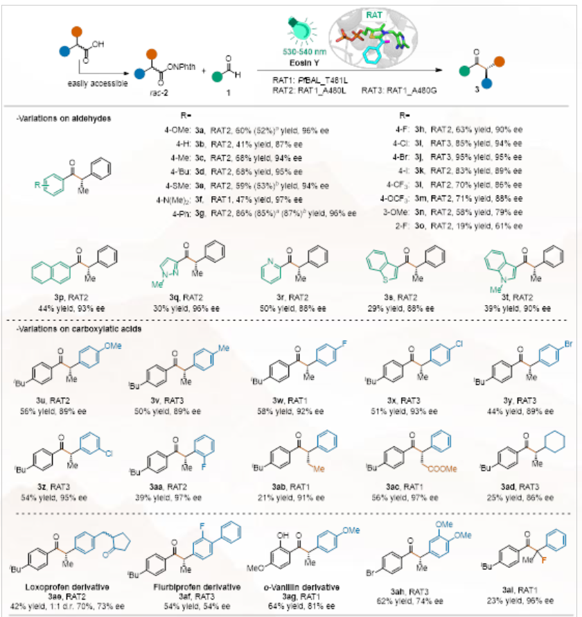 团队以4-甲氧基苯甲醛1a和自由基前体氧化还原活性酯2a作为模板底物,探索了有机染料曙红Y和ThDP依赖酶的催化体系。随后通过分子动力学模拟和半理性设计构建了小而精的突变体库,能够快速、低成本地获取最优突变体酶。该体系有非常好的底物耐受性,能够接受的底物包括各种邻、间、对位取代的芳香醛、杂环芳香醛和各种取代基的羧酸衍生物。文章展示了35个例子,对映选择性最高达97% ee,凸显了酶可调的活性口袋对于游离自由基立体化学的精妙调控作用。