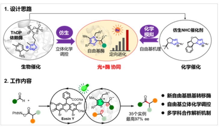 南京大学化学化工学院黄小强特聘研究员,与化院梁勇教授、中国科学技术大学/中国科学院强磁场科学中心田长麟教授合作,开发了焦磷酸硫胺素(ThDP)依赖酶和光催化协同的双催化新体系,该体系是自然界中全新的、现有化学方法难以实现的全新分子生化体系,不仅极大地扩展了酶的催化功能、为绿色生物制造提供了丰富元件,还为化学领域的手性精准控制难题提供了新策略,有望引领光生物制造新方向。成果以“A light-driven enzymatic enantioselective radical acylation”为题,2023年12月18日在线发表于Nature期刊,论文链接: https://www.nature.com/articles/s41586-023-06822-x。