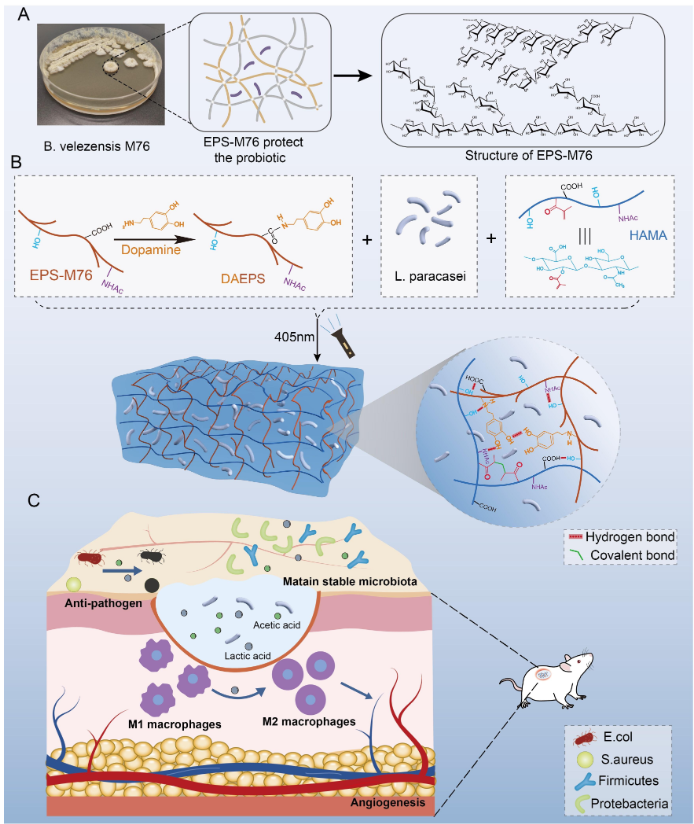皮肤微生物群在伤口愈合中发挥着重要作用,传统的抗菌水凝胶在杀死致病菌的同时不可避免的抑制皮肤益生菌的生长,从而破坏皮肤菌群的平衡。研究团队基于细菌胞外多糖(EPS),设计了一种既能抵御致病菌又能保持皮肤菌群稳定的活益生菌水凝胶。包埋在水凝胶中的副干酪乳杆菌(Lactobacillus paracasei TYM202)具有促进伤口愈合的活性,而水凝胶基质 EPS-M76具有益生元活性,可促进副干酪乳杆菌的增殖和新陈代谢。此外,该水凝胶可降低伤口愈合过程中的炎症发生率,同时促进血管生成,增加胶原蛋白沉积。该论文得到华南理工大学食品科学与工程学院万芝力教授的大力支持。我院2021级硕士生徐鸿涛为第一作者,高洁副教授以及华南理工大学万芝力教授为通讯作者。