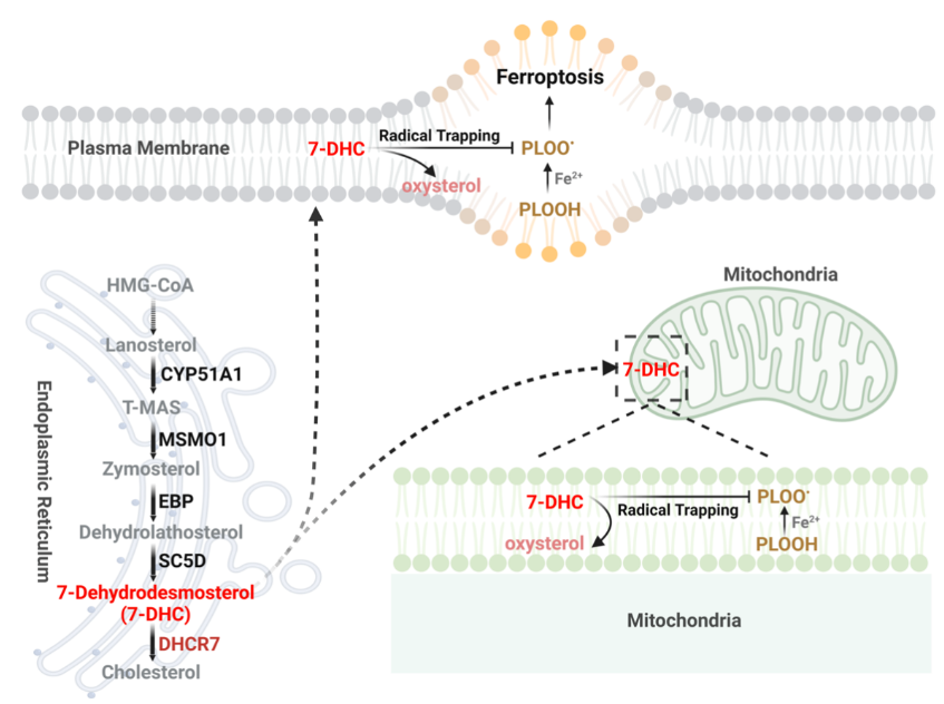 总的来说,研究团队发现,胆固醇合成通路关键酶能通过调控7-DHC这一中间代谢物的水平差异调控铁死亡敏感性,通过靶向调控7-DHC水平有望成为癌症和缺血再灌注器官损伤的治疗策略。