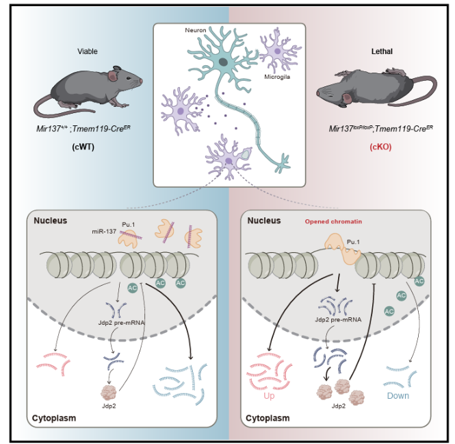 小胶质细胞约占脑细胞的10%,是脑实质中唯一起免疫作用的单核吞噬细胞,其功能失调与几乎所有中枢神经系统疾病相关。该研究首先发现miR-137在小胶质细胞高度富集于细胞核中,通过构建miR-137在小胶质细胞中特异敲除的小鼠模型,研究人员发现miR-137缺失对成年小鼠的存活至关重要,表明其在小胶质细胞介导的免疫调控中可能发挥关键作用。进一步研究发现,miR-137缺失会导致小胶质细胞的吞噬作用减弱、炎症反应和神经元毒性增强,并严重影响小胶质细胞的稳态维持及其介导的神经发育。有意思的是,普通、单细胞转录组联合分析结果显示,miR-137介导的转录后基因沉默在调控小胶质细胞的基因表达中并不起主要作用,而转录调控才是导致小胶质细胞基因表达变化的主要机制。为了进一步揭示转录调控的分子机制,研究人员通过ATAC-seq、ChIP-seq等组学技术,发现miR-137缺失影响染色质开放状态,可以使与小胶质细胞发育和功能高度相关的关键转录因子PU.1更多地结合到染色质上。通过EMSA和SPR等生化实验分析,研究人员进一步证实miR-137可以和PU.1特异性结合,并通过抑制PU.1介导的转录调控来影响小胶质细胞的基因表达。研究人员随后鉴定出一个受PU.1调控的关键靶基因Jdp2,该基因编码组蛋白伴侣蛋白JDP2。在miR-137缺失的小胶质细胞中,JDP2表达升高导致的组蛋白乙酰化降低与下调的差异表达基因显著相关,而敲低Jdp2可以明显改善由miR-137缺失导致的小胶质细胞功能失调。
