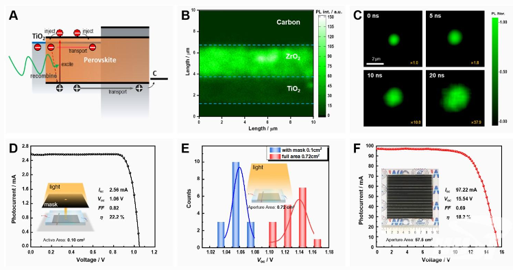 在本工作中,通过模拟仿真及载流子动力学测试,三层介孔膜结构器件展现了不同于传统p-n结电荷分离机制。在传统平面堆叠光伏器件中,光生载流子(空穴和电子)产生后在吸光层中长距离迁移,然后在空穴传输层(或电子传输层)界面被选择性提取,对应的电子传输层(或空穴传输层)起着阻挡异种载流子(空穴或电子)复合的作用,因此在传统太阳能电池中电子传输层及空穴传输层的存在是获取高光电转化效率的必要条件。而在三层介孔膜结构的可印刷介观太阳能电池中,吸光材料被局域在三维互穿网络结构的电子传输层纳米孔中,吸光材料所产生的光生电子通过3D注入过程快速有效的注入到介观电子传输层中,电子和空穴分别在电子传输层和吸光材料层中传输。这种介孔膜中载流子3D注入过程解耦了充分吸收光所需的吸收层厚度与确保电荷充分收集所需的载流子扩散长度之间的矛盾,在电子传输层/钙钛矿界面,而不是在钙钛矿/碳界面的复合,是导致电压损失的主要原因,因此无空穴传输层的阻挡,三层介孔膜结构的可印刷介观钙钛矿太阳能电池也可获得超高的光电转化效率。为此,针对多孔电子传输层内表面氧空位缺陷带来的性能损失关键制约,利用由软路易斯酸阳离子与硬路易斯碱阴离子构成的盐钝化剂进行处理,促使氧空位电离释放所束缚的电子,有效钝化了氧空位,成功将可印刷介观钙钛矿太阳能电池效率提升至第三方认证的22.3%。与此同时,57.5cm2微型模组开口面积效率达18.2%,模组中单条子电池的电压超过1.1伏。