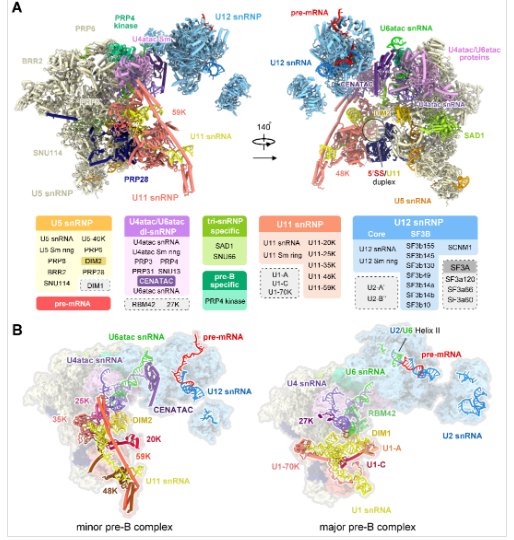 这一成果来自西湖大学特聘研究员万蕊雪团队和结构生物学讲席教授施一公团队,第一作者是西湖大学副研究员白蕊。他们首次报道了完全组装的次要剪接体的高分辨率三维结构,展示了在U12型内含子上组装过程的关键构象——预催化剪接体前体(precursor pre-catalytic spliceosome,定义为“pre-B复合物”),解析并鉴定了56个蛋白和6种RNA(pre-mRNA和5种snRNA),整体分辨率高达3.3埃。