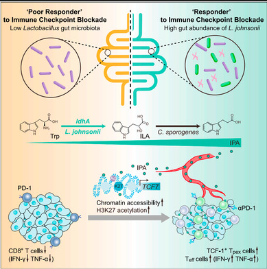 近日,浙江大学医学院附属第二医院王良静教授团队联合浙江大学医学院附属邵逸夫医院陈淑洁主任医师团队在国际顶级期刊《细胞》上发文。他们发现一种肠道菌群产生的小分子代谢物吲哚丙酸,可以持续调动T细胞杀伤肿瘤,增强抗PD-1单抗在结直肠癌、乳腺癌色素瘤等实体肿瘤中的疗效,有望为肿瘤的精准治疗提供新策略。