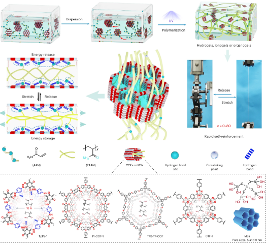 研究结果表明,该设计策略适用于多种聚合物单体和共价有机框架(或分子筛)制备的水凝胶、离子凝胶和有机凝胶,具有很好的普适性。研究成果赋予了聚合物凝胶在大形变下的高回弹、无(低)滞后性能,为理解高分子链纳米限域作用机制和凝胶弹性行为的构效关系,以及凝胶体系中通过应力耗散降低裂纹扩展敏感性提供了理论基础。该方法所制备的高回弹韧性凝胶,有望实现在可穿戴器件、人机交互、离子皮肤等领域的广泛应用。