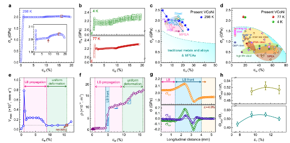 团队制备了多主元VCoNi合金纳米结构,面心立方结构的纳米晶粒包含化学短程有序。纳米结构的初始拉伸变形是吕德斯带(Lüders band)扩展,研究人员发现:一旦吕德斯带开始扩展,在其前端就已经发生了塑性失稳、即早期颈缩 (premature necking),在颈缩处随即形成了三轴应力状态,快速产生了高密度位错,其中位错密度增量为9.3×1014 m-2,位错增殖速度为4.61013 m-2 s-1。这些位错引起了林位错加工硬化和异质变形诱导硬化,后者是几何必需位错与化学短程有序的应变场之间交互作用的结果。在吕德斯带扩展过程中,加工硬化体现出关键作用 反过来抑制并稳定住了吕德斯带的失稳扩展,还能使纳米结构进行均匀变形。据此,研究人员克服了高强纳米结构的低塑性瓶颈,室温准静态拉伸性能为屈服强度2.0 GPa和拉伸塑性16%,在极端低温、即液氦和液氮温度下则获得记录级性能2.2 GPa和20%。这些结果展现了一个另辟蹊径的“抑制失稳”而非传统“推迟失稳”的加工硬化途径,即低加工硬化能力引起早期塑性失稳 - 失稳则诱导位错产生和加工硬化 - 加工硬化反过来抑制失稳。