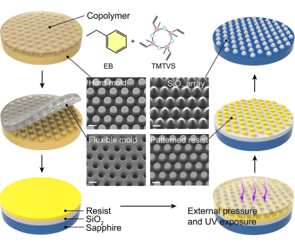 周圣军教授团队提出了一种柔性纳米压印技术在蓝宝石衬底上加工二氧化硅微结构阵列的方法。由于蓝宝石衬底具有翘曲,采用光刻工艺难以保证微结构阵列的一致性,而柔性纳米压印技术能够完全适应衬底翘曲,实现均匀分布的微结构阵列制备。与传统的图形化蓝宝石衬底相比,具有二氧化硅微结构阵列的蓝宝石衬底不仅可以抑制氮化镓材料在锥形图案侧壁上的生长,降低外延层的位错密度,提高器件有源区的发光效率,而且可以对量子阱有源区辐射光子的传播方向进行再调制,更有效地将来自有源区的光耦合进入芯片上下表面的逃逸光锥,提高Mini-LED显示芯片的光提取效率。柔性纳米压印工艺为在曲面上制备微结构提供了高质量、高效率的解决方案。