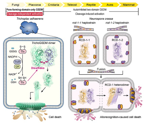 图:低等真核生物丝盘虫和粗糙脉孢菌编码只含有膜打孔结构域的GSDM蛋白,通过非蛋白酶切割的新颖方式激活膜打孔活性,执行细胞死亡的功能。