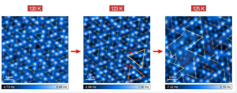 图3. 随着温度升高冰表面预融化过程的原子级分辨成像