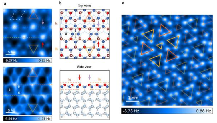 图2. 冰表面的Ih和Ic 晶畴的原子力显微镜实验图(a),对应的结构模型示意图(b),以及周期性超结构的原子力显微镜实验图(c)