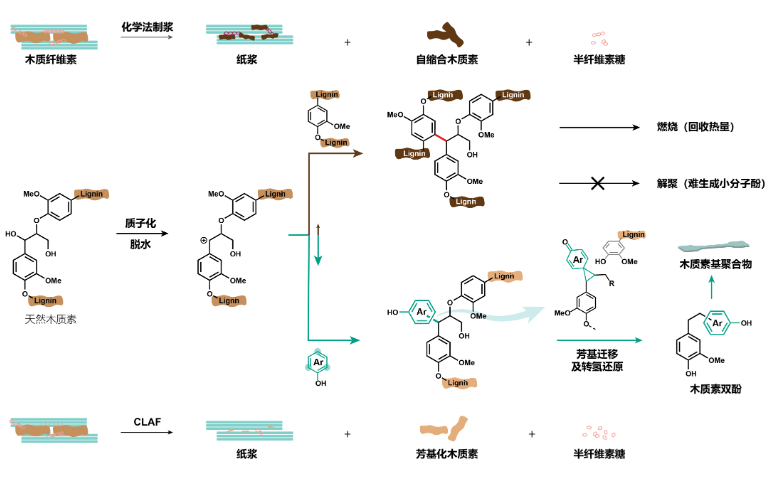 木质纤维素是自然界中储量最丰富的可再生原料,广泛来源于木材、竹材、秸秆等,主要由纤维素、半纤维素和木质素(简称“三素”)组成。从微观来看,纤维素分子交织成束,分散于半纤维素和木质素组分中,形成类似于“钢筋混凝土”的结构。其作为可再生化工原料使用的关键难题是,如何高质量地分离三素以获取易于规模化利用的原料,供下游转化使用。现代化学法制浆造纸中,通过酸、碱等化学处理方式,可实现木质素、半纤维素和纤维素组分的部分分离,纤维素纸浆仅约占生物质总量的一半,而占总量20%至30%的木质素发生不可控缩聚,难以完全与纸浆分离,并导致木质素的催化反应活性大幅降低,通常作为工业废料直接燃烧。作为最具利用价值的可再生碳资源,木质纤维素三素如果无法充分利用,将限制生物质化工发展的经济性和环境友好性。