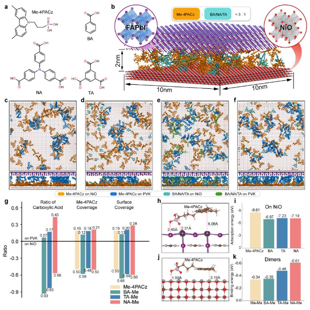 图1. 基于第一性原理计算的不同hybrid HSLs界面自组装状态NA诱导Me-4PACz实现最佳自组装成膜