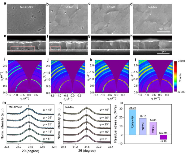 针对上述问题,华中科技大学武汉光电国家研究中心陈炜、刘宗豪团队创新地提出一种埋底界面自组装单分子杂化(hybrid)策略,即在高性能自组装单分子Me-4PACz前驱液中引入同样具有大π共轭基团且含有对称多羧基的三苯胺单体(4,4’,4’’-硝基三苯甲酸(NA))。通过对比TA.、BA等共吸附剂,发现NA作为共吸附剂,其分子结构更有利于增强与Me-4PACz间强π-π相互作用,能更好的减少Me-4PACz超薄膜在沉积过程中的自聚集效应,诱导Me-4PACz分子在2nm尺度上获得更加均匀的分布(图1),从而提高了钙钛矿薄膜埋底界面处光生载流子的抽取效率。另外,分子动力学模拟结果显示,Me-4PACz平趴式分布在氧化镍/钙钛矿界面,其膦酸基团和π环均可以与氧化镍基底作用,且Me-4PACz的π环能够钝化Vpb2+深能级陷阱,从而减少界面非辐射复合。不仅如此,多羧基NA单体的存在使得钙钛矿溶液在Me-4PACz上的润湿性得到了有效改善,消除了埋底界面处的纳米孔隙并释放了钙钛矿薄膜压缩应力,增强钙钛矿埋底界面结晶性,这进一步降低了埋底界面缺陷浓度,且有利于大面积钙钛矿薄膜的均匀制备(图2)。