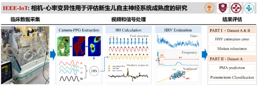 浙江大学丽水医院纪建松教授、南方科技大学卢洪洲教授、王文锦副教授组成的医工交叉产学研团队近期完成了全国首个多中心新生儿重症监护(NICU)研究:基于相机的非接触新生儿心率变异性(HRV)监测,并利用相机监测的HRV指标创新性地评估新生儿自主神经系统发育的成熟度。相关研究成果发表于国际知名SCI期刊IEEE Internet of Things Journal (中科院一区,TOP期刊),题为“Camera-Based Heart Rate Variability for Estimating the Maturity of Neonatal Autonomic Nervous System”。