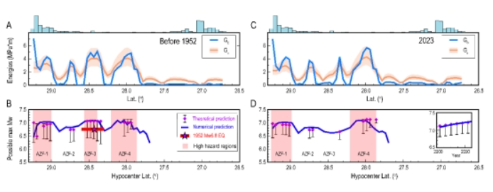 图3. 基于断层闭锁状态和震源物理理论评估的安宁河-则木河断裂的地震潜能。图A表示1952年M6.8地震前积累的弹性能和破裂能,图B表示1952年地震前断层的地震潜能。图C-D与图A-B类似,但表示现今的情况。图片最上面表示地震活动性分布情况。