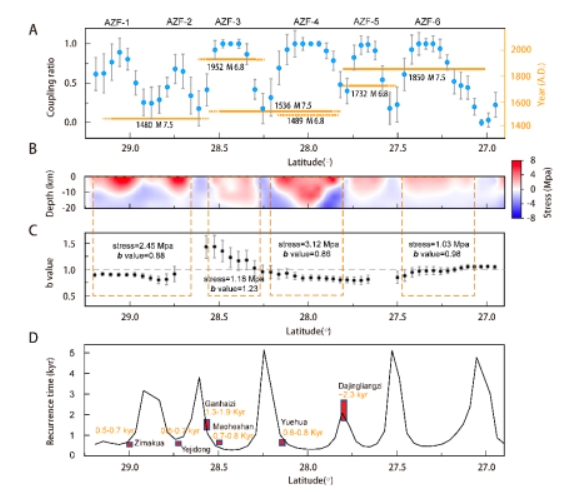 图 2. 图A表示平均断层闭锁率沿走向的变化,橙色线段表示历史地震破裂范围(Wen et al.,2008). 图B和C表示自上次强震发生后至今积累的剪切应力与b值的比较。图D表示根据断层闭锁率和破裂动力学理论估算的地震复发周期(黑线)与地震地质探槽结果(红色条棒)之间的对比。
