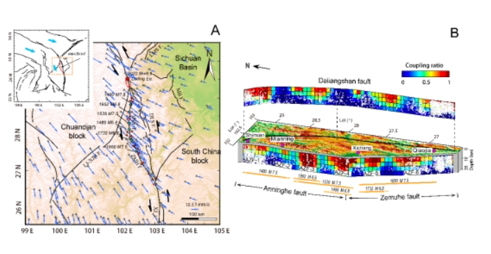 图1.安宁河-则木河断裂构造背景图(A)和反演的断层精细闭锁率分布(B)。图A中黑线表示区域活动构造断裂,蓝色箭头表示GNSS速度场。图B表示反演得到的断层闭锁率分布,从蓝色到红色表示断层闭锁程度逐渐增加。