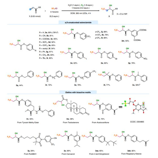 总之,作者发现了一种高效实用的烯烃羟基五氟硫基化方法,该方法适用于各种单取代和二取代烯烃(包括苯乙烯和吸电子烯烃),具有广泛的底物范围和官能团耐受性。此外,五氟硫基醇的相关衍生化反应可以为构建含有SF5基团的复杂分子提供新的途径。