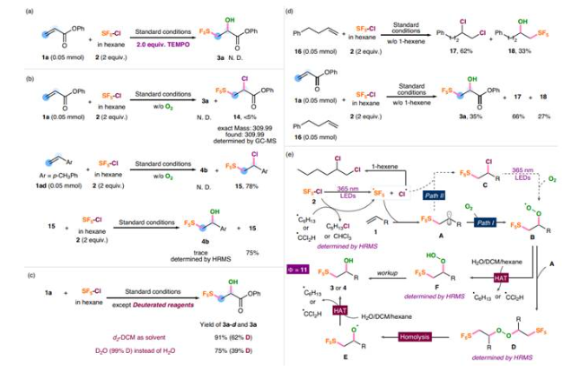 作者进行了相关的衍生化反应,合成获得了相关的α-SF5酮、SF5二醇、SF5环酯等,并且通过机理验证实验等探究了反应过程可能的机理。