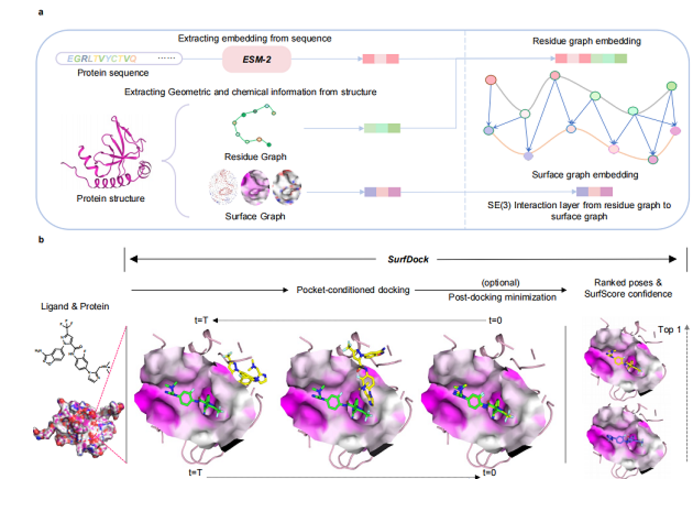图1. SurfDock 架构图。a: SurfDock中蛋白质多模态表征示意图。b: SurfDock工作流程概述。