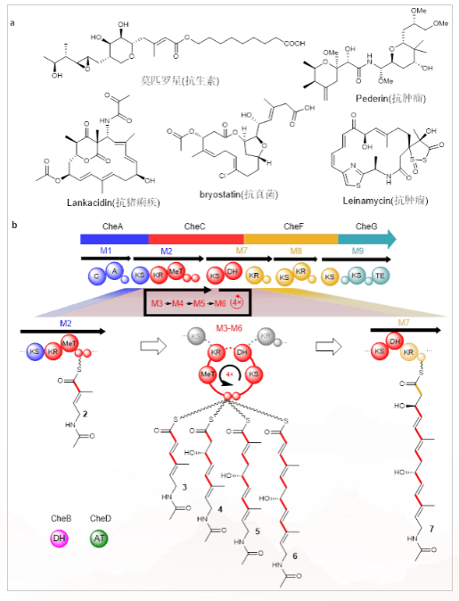 图a、优良活性的trans-AT聚酮分子;b、trans-AT聚酮合酶CheC的特殊迭代作用方式