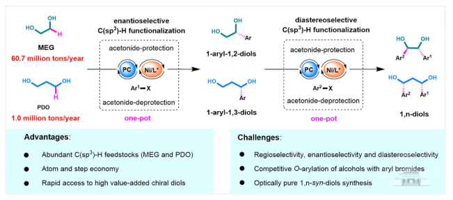 孔望清课题组此前通过光促HAT/镍协同催化的策略,成功实现无导向氧杂环和1-脱氧糖的C(sp3)-H键立体选择性官能团化反应(J. Am. Chem. Soc.2023,145, 5231–5241;Nat. Chem.2024,16, 2054–2065.),基于这一策略,作者设想能否直接使用大宗廉价的化学品乙二醇或1, 3-丙二醇为原料,对其氧邻位C(sp3)-H键进行多次立体选择性官能团化来实现光学纯1, 2-二醇和1, 3-二醇的模块化合成。但是这个策略面临着诸多挑战:1、反应的区域和立体选择性难以控制,目前对于链状醚类化合物的C(sp3)-H键选择性官能团化还鲜有报道;2、双羟基的结构可能会与官能团化试剂发生副反应而使催化剂失活。