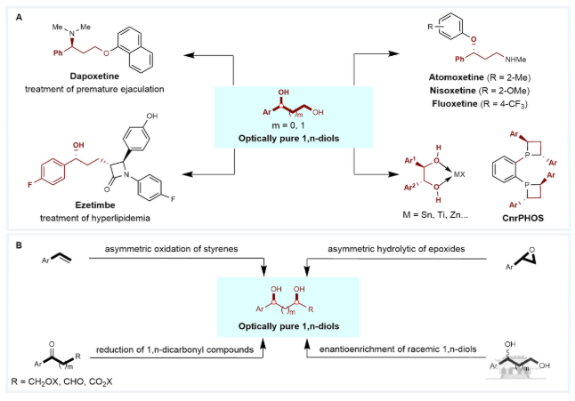光学纯的1, 2-二醇和1, 3-二醇不仅是众多小分子药物的重要砌块,还是多种不对称催化剂的核心骨架,是一类极具价值的结构。目前已经开发出了众多合成光学纯的1, 2-二醇和1, 3-二醇的方法,但这些方法都无法避免地使用到有毒的金属催化剂或以立体化学纯的烯烃为原料,因此一个成本低廉,选择性优异且绿色的合成光学纯的1, 2-二醇和1, 3-二醇的方法亟待开发。