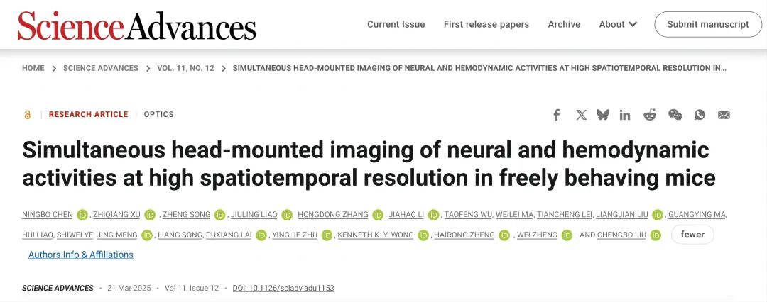 近日,中国科学院深圳先进技术研究院医学成像全国重点实验室郑海荣院士、刘成波研究员和郑炜研究员团队,开发了一款重量1.7克的头戴式成像显微镜,实现了自由活动小鼠神经元活动与血氧代谢的同步高时空分辨成像,为大脑神经血管耦合机制探索和脑机接口技术开发提供了新思路。研究成果以"Simultaneous head-mounted imaging of neural and hemodynamic activities at high spatiotemporal resolution in freely behaving mice"为题发表于Science Advances期刊。该工作得到了中国科学院先导B专项(XDB0930000)以及医学成像科学与技术系统全国重点实验室资助,为先导B专项开展后续工作提供了关键技术。论文第一作者分别是陈宁波助理研究员、徐智强副研究员、宋政博士后和廖九零副研究员。合作团队包括中国科学院深圳先进技术研究院朱英杰研究员团队、香港理工大学赖溥祥教授团队、香港大学Kenneth K. Y. Wong教授团队。