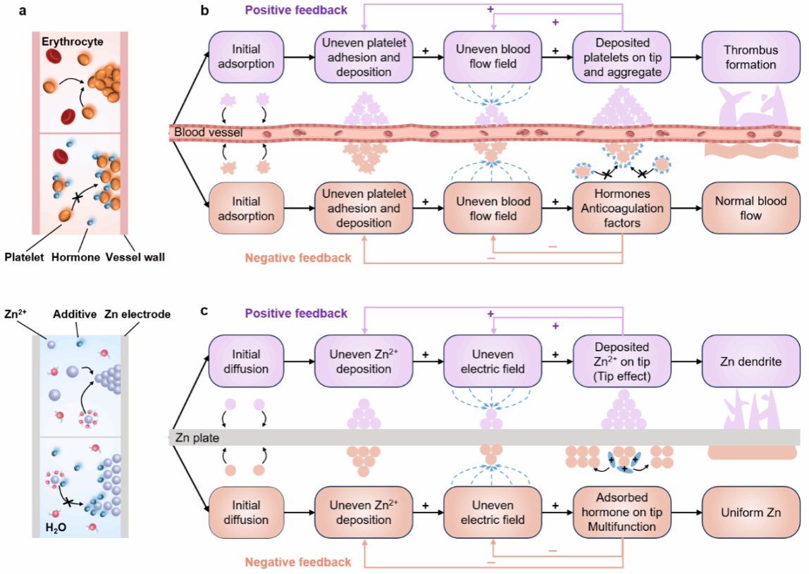 针对上述挑战,西北工业大学黄维院士团队官操教授课题组受血液系统中动态凝血/抗凝过程的启发,提出了一种自调节的负反馈“激素”电解质(图1)。仿生“激素”重塑Zn2+配位微环境,动态吸附在初始不均匀的锌尖端上,自发排斥Zn2+并屏蔽H2O分子,从而形成负反馈回路,优化副反应问题和Zn2+沉积过程(图2)。与以往报道的基于静态修饰的电解质策略相反,负反馈电解质动态感知和调节出现的不均匀锌尖端,显著提高高电流密度/容量条件下的锌负极稳定性。采用“激素”电解质的锌电极可以在20 mA cm-2/10 mAh cm-2(85.5% DOD)和50 mA cm-2/20 mAh cm-2(68.3% DOD)条件下稳定循环240小时,累积容量高达6000 mAh cm-2。此外,该电池具有高能量/功率密度(252.63 W kg-1/101.05 Wh kg-1),为开发长时稳定的实用化金属电池提供新颖的策略。