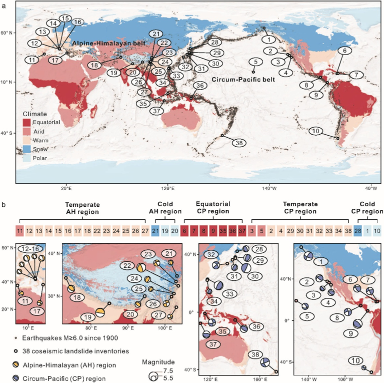 1970年以来全球地震诱发滑坡事件的空间分布和地震带-气候分区