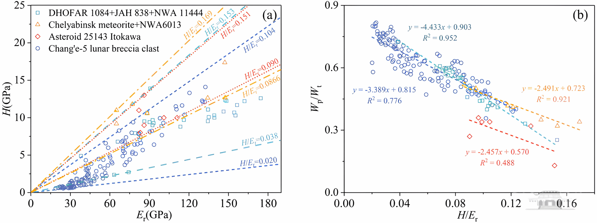 图2 月球和小行星表面物质(陨石和样品)弹塑性力学指标对比