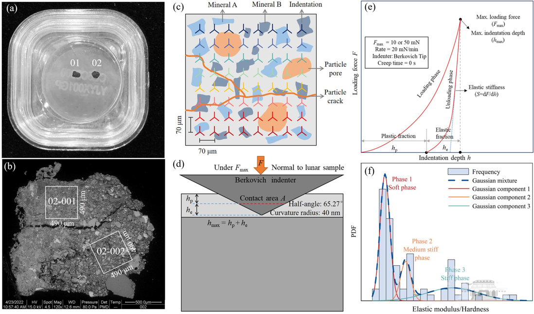 论文首次基于网格纳米压痕技术实现了嫦娥五号角砾岩岩屑力学非均质性的定量分析,并结合贝叶斯和有效介质理论科学评估了月岩的弹性模量(38~56 GPa),可为未来月面相关作业提供关键工程数据参考。同时对比分析了月球和小行星表面物质(陨石和样品)的弹塑性力学指标,发现月球样品和月球陨石的材料韧性更优。研究结果有助于更好地认识无大气星体表面过程(如不同规模的陨石撞击和太阳风注入等)对星体表面风化层物质工程物性的改造效应。