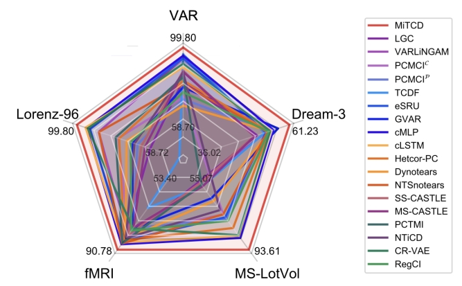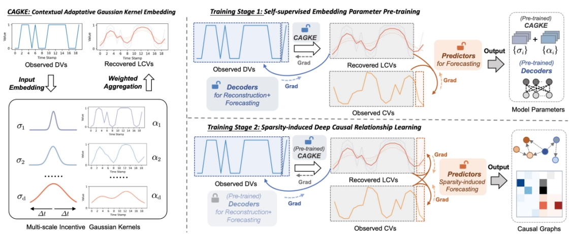 该工作起源于2023年赵春晖教授团队揭榜的华为火花价值奖难题。通过学术创新与华为产业需求的深度融合,赵春晖教授课题组开辟了混合异构时序分析的特色研究方向。该工作首先揭示了混合时间序列存在的两种变量信息不对称挑战,首次提出了隐连续性恢复的原创学术思想,并深入探讨了其理论保障、可行条件与技术实现。该工作从变量嵌入方式、模型训练技巧、稀疏因果挖掘三个角度设计了一种全新的深度混合时序因果关系挖掘范式,攻克了在一致的信息粒度和变量分布空间内挖掘显著因果结构的研究瓶颈。充分的实验结果表明,该方法在涵盖了气象、脑电、生态、基因表达等领域的五大格兰杰因果推断基准的16个数据集上均达到最先进的水平,展现了面向现实世界高维、非线性、变量混合时序数据的卓越的因果发现能力,并体现出强大的可泛化性、可迁移性和可解释性。