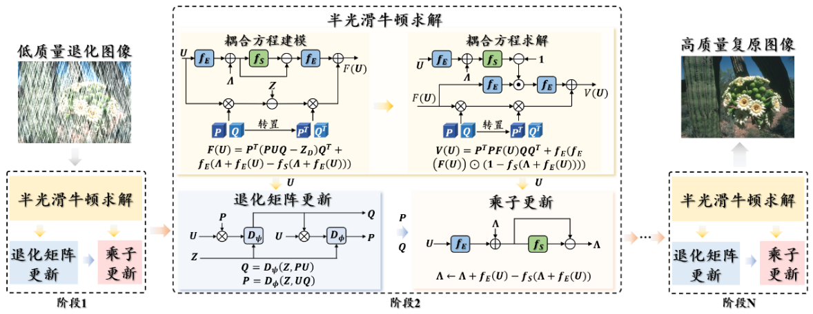 深度展开方法(DeepUnfolding, DU)是图像复原领域兼具理论深度与实践价值的网络设计范式,通过将数学优化算法的迭代求解映射为可学习的网络结构,在网络中充分融入模型先验,显著增强网络推理的可解释性和网络学习的鲁棒性。然而,传统深度展开网络多基于一阶优化算法设计,存在收敛速度慢、求解精度低等缺陷,极大制约了深度展开网络的运行效率与图像复原性能。