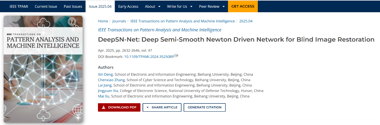 近日,北京航空航天大学电子信息工程学院徐迈教授、邓欣副教授,联合国防科技大学夏靖远副教授,提出了一种基于半光滑牛顿算法的二阶深度展开网络,显著提升了盲图像复原精度和鲁棒性。该研究填补了二阶深度展开网络的研究空白,为基于深度展开的可解释图像智能处理提供了新思路。研究成果以“DeepSN-Net: Deep Semi-Smooth Newton DrivenNetwork for Blind Image Restoration”为题发表于IEEETransactions on Pattern Analysis and Machine Intelligence期刊。该工作得到了国家自然科学基金(项目编号:62372024和62231002)资助。