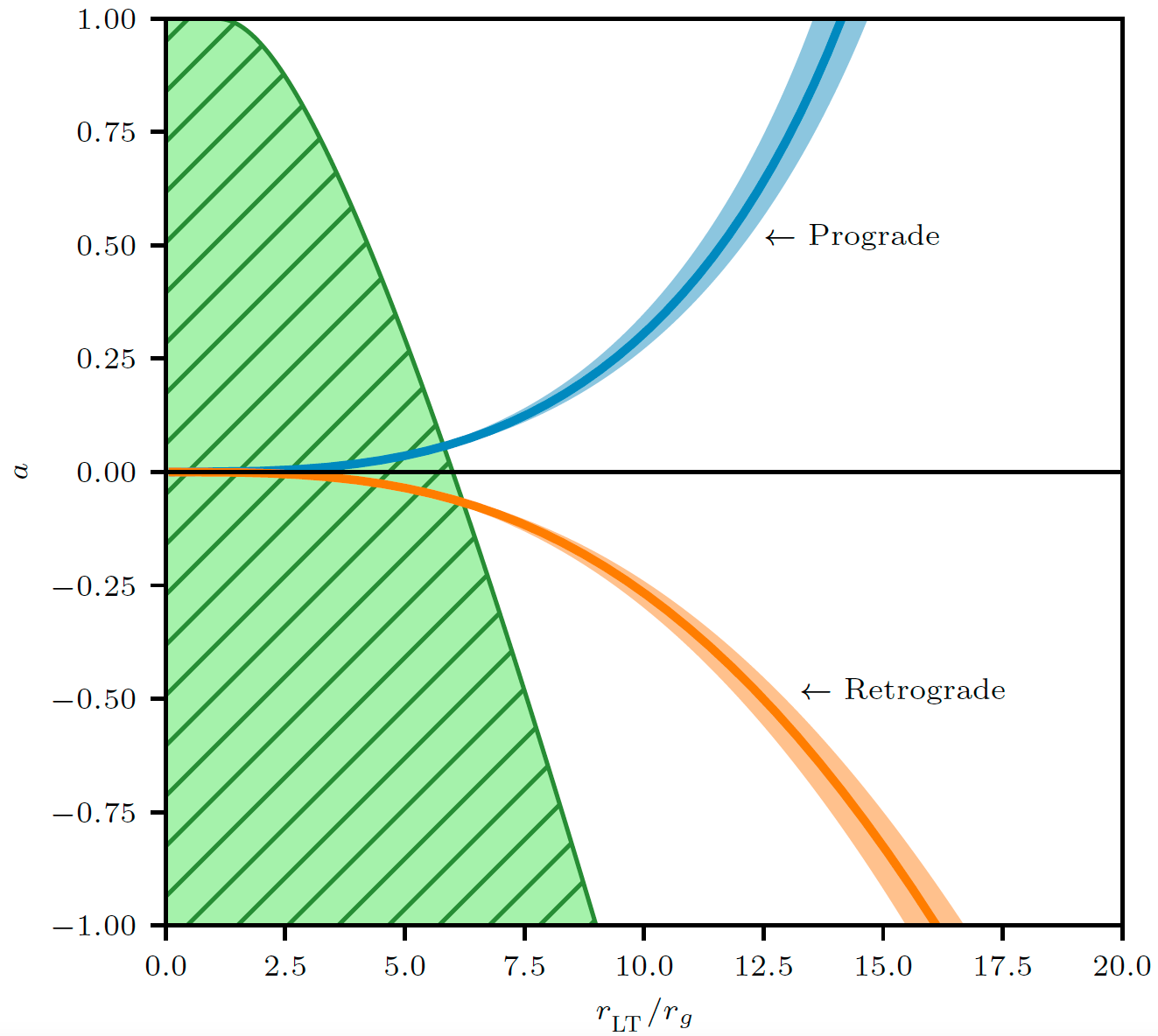 图1:M87黑洞自旋参数与有效的进动吸积盘半径的约束关系,蓝/橙线分别代表吸积盘角动量相对于黑洞自旋为顺向/逆向