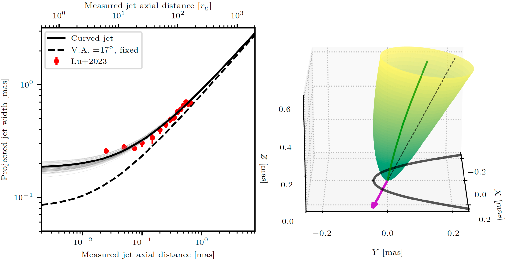 图2:黑洞喷流的弯曲结构。左图实线显示弯曲的喷流所推算出的其在临近黑洞区域的宽度(红线为观测数据[2]),右图为弯曲的喷流(绿色锥体)的三维模型,喷流绕着黑洞的自旋轴(洋红色)作“陀螺”般的运动