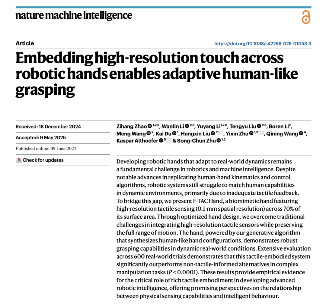 机器手作为人形机器人与外界交互的重要媒介,是机器人功能性的直接体现,需要“人手”参与的工作都是机器手的应用场景,在特定场景(如精密装配)中展现出超越人类手部的稳定性。2025年6月9日,由北京大学人工智能研究院、北京大学武汉人工智能研究院、北京通用人工智能研究院、北京大学工学院和伦敦玛丽皇后大学联合组成的科研团队在《自然•机器智能》(Nature Machine Intelligence)上发表题为“Embedding high-resolution touch across robotic hands enables adaptive human-like grasping”的论文,标志着该团队在高分辨率触觉感知机器手领域取得重要进展。由于其可提供超越人类手部稳定性的操作,该科研成果在对操作精度有极高要求的辅助手术、高精密组装类工作以及航空航天、应急响应等领域有广泛的落地场景,并有望推动机器人技术在医疗、工业制造、特殊环境作业等领域的落地应用。