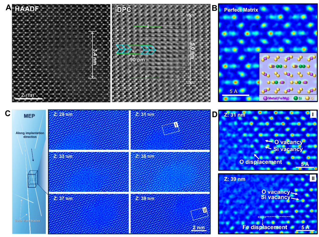 通过能量滤波多片电子织构成像获取深度方向上的原子结构,发现刻痕区域截面内发生了铁、氧、硅原子空位的形成与铁、硅原子的随机位移,打破了晶体对称性,并在高能粒子注入深度方向上这种原子结构的对称性破缺呈现随机性。如此变化,大大降低了结构演化的能垒,提高了物质转化的可能性;