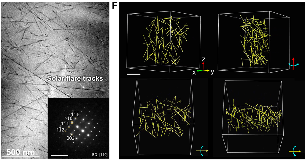 几十年来,科学家们发现,在月壤矿物中存在一些“笔直”的纳米尺度线状缺陷,被称为“太阳耀斑径迹(Solar Flare Tracks)”。这些刻痕源于太阳高能粒子(尤其是太阳耀斑爆发期间的粒子)撞击矿物晶体后留下的痕迹。然而,由于受到地磁场和大气圈的保护,我们在地球上几乎观察不到这种现象。