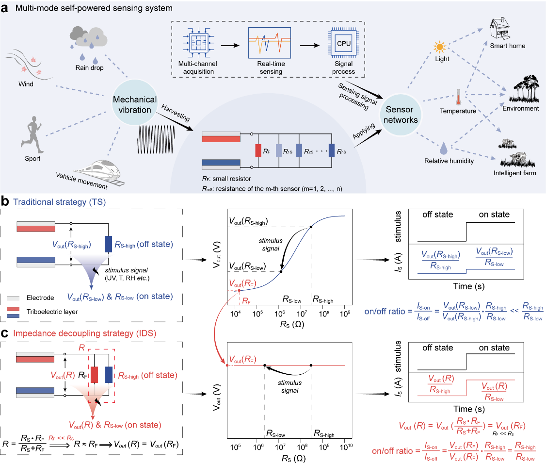 基于该阻抗解耦策略构建的自供能多模态传感系统,适用于偏远无人区、军事战场等极端环境下的长期部署,其独特的自供能特性和实时多模态传感功能将为生态网络监测的构建、自然灾害早期预警及战场形势感知等关键领域提供技术支撑。研究团队成员刘书海表示:“该策略有效解决了自供能传感系统中的阻抗耦合难题,为自供能传感系统的构筑提供了新思路,未来有望结合多种能量收集手段,构建全天候无人值守多模态传感网络。”