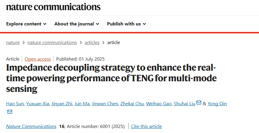 近日,兰州大学材料与能源学院刘书海青年教授研究团队提出阻抗解耦策略用于提高自供能传感系统中的传感精度,实现实时多模态传感。相关成果以“Impedance decoupling strategy to enhance the real-time powering performance of TENG for multi-mode sensing”为题于2025年7月1日发表在国际期刊《Nature Communications》,为自供能多模态传感技术的应用迈出关键一步。