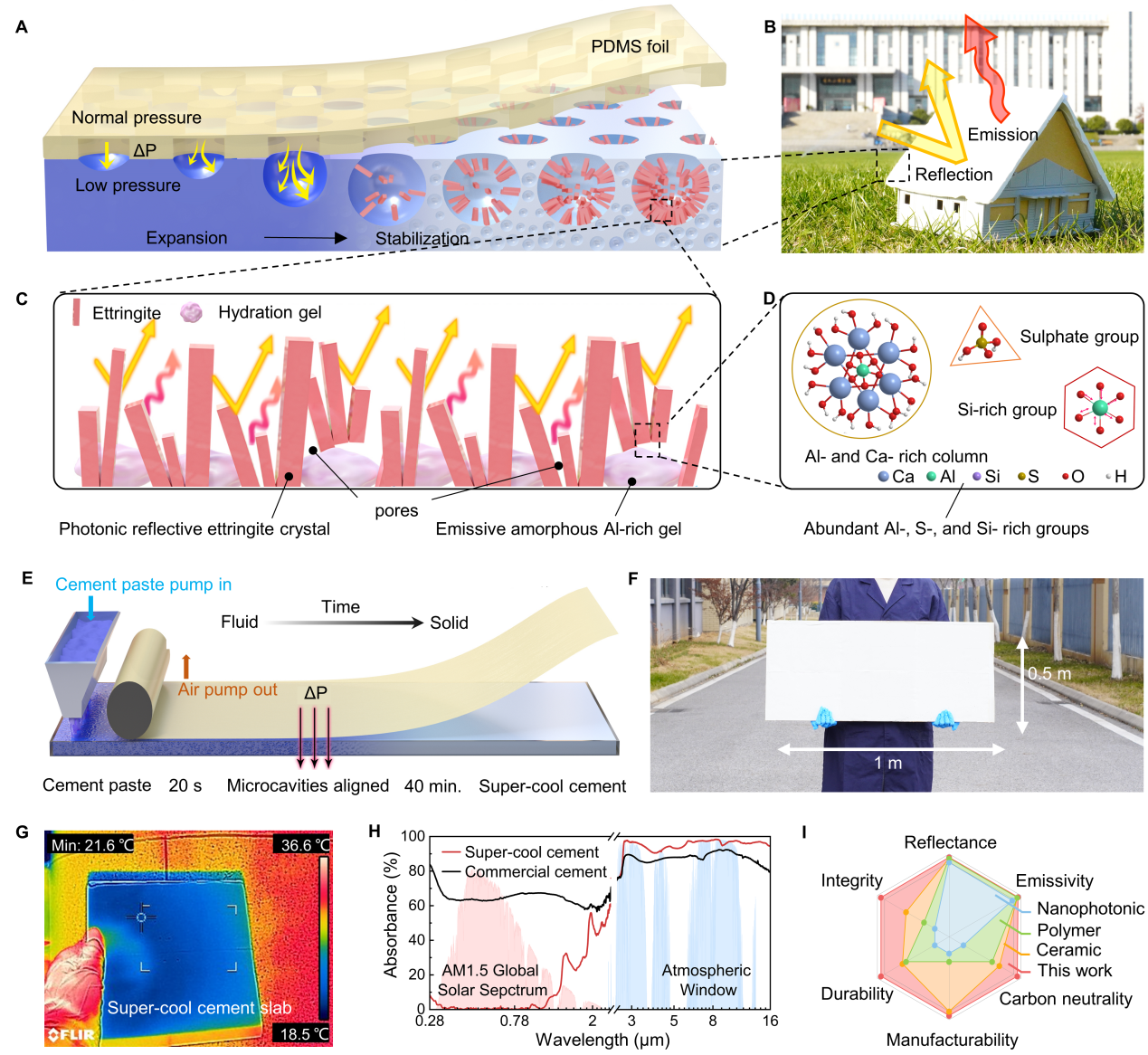 随着全球气候变暖与城市制冷需求的持续增长,建筑运行阶段的能耗与碳排放问题日益凸显。传统空调系统能耗巨大,导致建筑运行成为全球碳排放的重要来源之一。被动式辐射冷却(PDRC)因其无需外部能源驱动、可通过热辐射散热,在节能建筑领域被视为极具前景的解决方案。然而,现有辐射冷却材料多依赖复杂的纳米光子结构、陶瓷涂层或聚合物膜,普遍存在造价高、机械强度低、难以规模应用等问题,限制了其在建筑领域的落地与推广。水泥作为全球产量最高、应用最广的工程材料,具备良好的红外发射能力与结构稳定性,具有转化为辐射冷却材料的潜在优势。