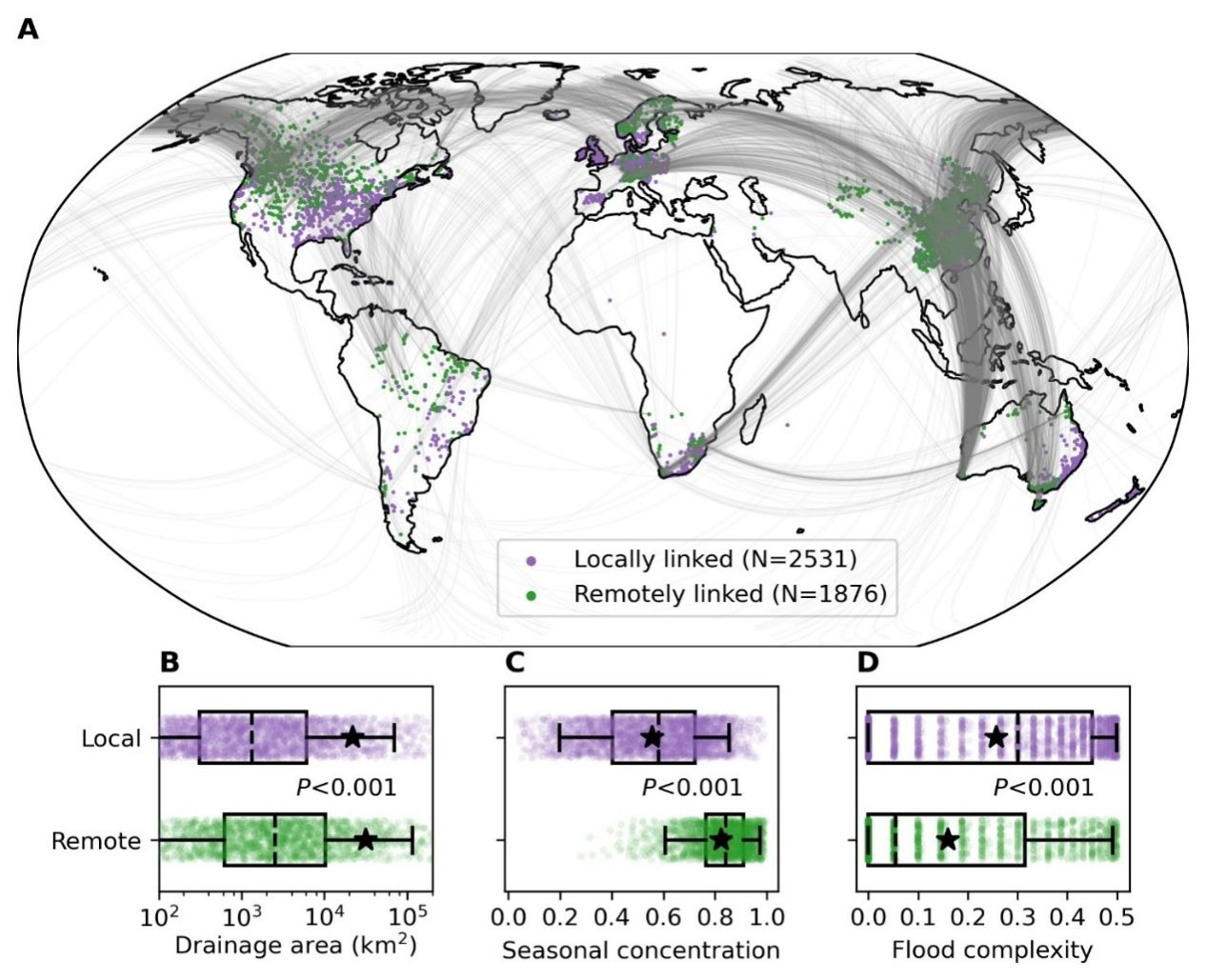 近日,南京大学地理与海洋科学学院杨龙教授团队通过系统收集和整合全球4400多个流域近200万个洪水记录,从复杂系统角度构建了一套描述流域水文过程时空联系的指标以及变化归因方法,首次揭示了全球流域洪水在行星尺度上的“同频共振”现象及其形成机制。